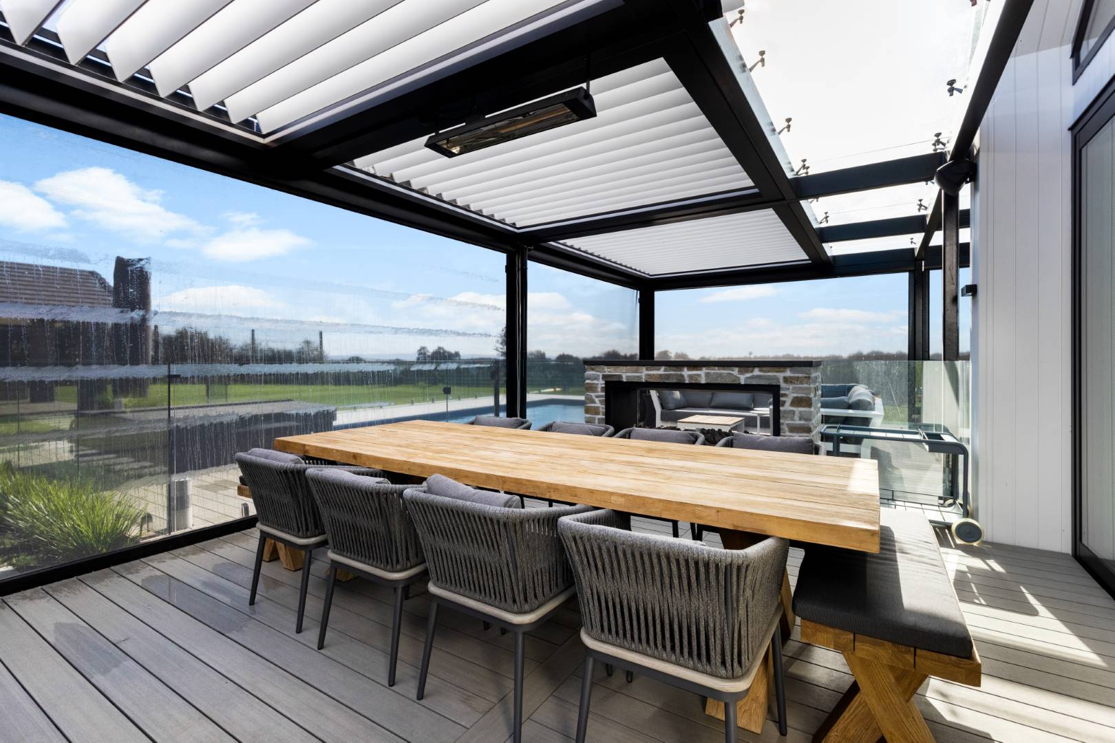 A rendere unico lo spazio esterno è la pergola Oskura Orienta di Sunroom, che si integra con eleganza all’architettura della villa. Caratterizzata da un design minimale e raffinato, Oskura Orienta è dotata di lame orientabili che consentono di modulare la luce naturale e regolare la ventilazione, offrendo il massimo comfort in ogni momento della giornata. La sua struttura robusta in alluminio garantisce grande resistenza agli agenti atmosferici, mentre la versatilità del sistema permette di adattarla a diversi contesti residenziali e contract.